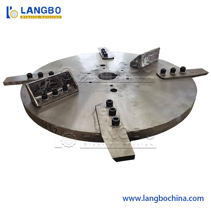 Waste plastic is fed into the machine's chamber where high-speed rotating blades and fixed blades work together to shear materials. Centrifugal force rapidly cuts materials into pieces, flakes, or sheets that flow along the chamber walls while undergoing continuous mixing and movement.